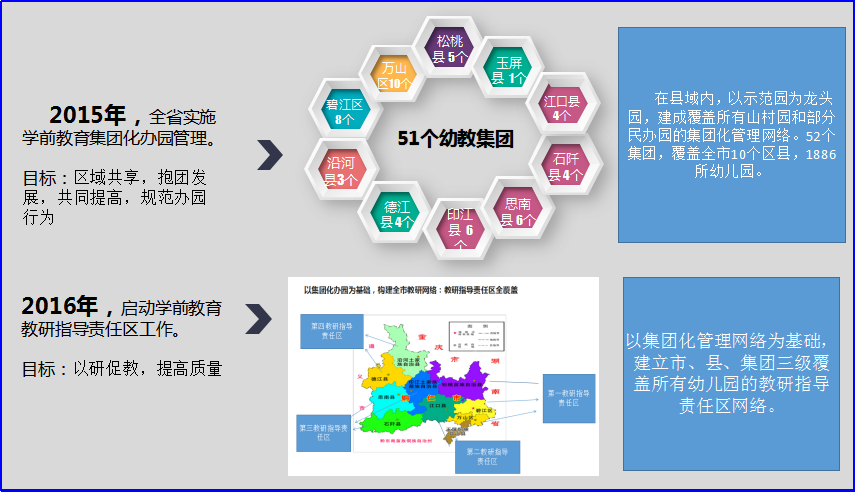 我市将实践经验编写成《铜仁市学前教育集团化管理课程资源中心建设指南》,在全市推广实施。通过梳理总结,一是明确了建资源中心的目的:1.更好的收集和保管集团内部教学资源,合理分配材料,及时补充制作幼儿园所需教学具,方便教师课程资源的获取。实现课程资源区域共享。解放教师时间,提高师幼互动质量。2.支持农村幼儿园规范管理、提高质量,探索实现乡村学前教育一体化管理的机制和策略。3.为片区教研提供物质保障,提供研训场所,共享研训资源。二是明确了资源中心建立的路径。农村幼儿园集团化管理资源中心以乡镇中心幼儿园为载体,以教研指导责任区或集团化办园所辖农村幼儿园为服务对象。原则上,资源中心建在乡镇中心幼儿园内。乡镇较大并有2所以上公办幼儿园的可建2个以上资源中心。所辖无山村园的集团可将资源中心上移,建在集团总园,服务于整个集团。资源中心的作用整合了管理、教研、资源共享三重作用。三是梳理出资源中心建设的要素要求。细化了对场地、办公用具、人员、材料与课程资源、制度与保障五个要素要求。