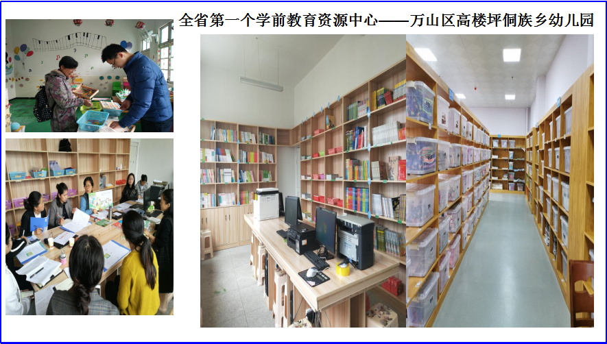 一、试点先行,探索建设方法。2018年,肖老师、吴慧鸣老师以每月一次的频率赴我市万山区高楼坪侗族乡中心幼儿园进行实地指导,建起了全省第一个资源中心。