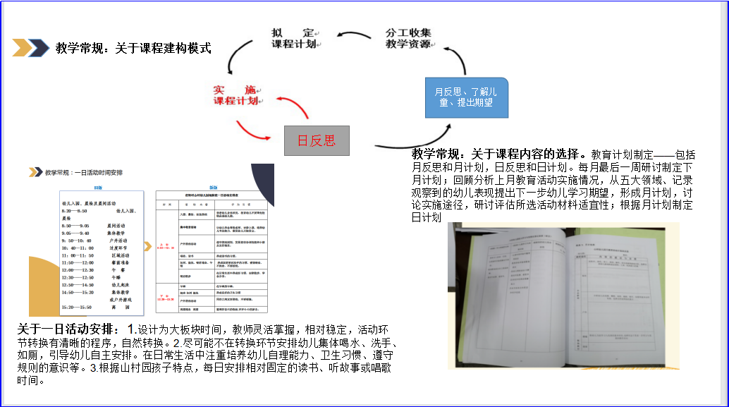 在此过程中形成了一些达成共识的教学常规,如关于一日活动安排,大版块的一日活动时间能保证幼儿每天两小时的户外活动时间和一小时的游戏时间,且更具弹性;关于游戏,给予孩子足够的游戏时间、游戏空间、丰富的材料、真正的自主,当你不知道怎么指导时,宁愿做一个静静的观察者;关于评价,不仅仅是寻找“哇时刻”,而是更加全面客观地评价孩子的现有水平,以便提出下一步合理期待;关于课程内容的选择,不知道教什么的时候可以照着教材上,当我们养成观察-反思的习惯后,发现不照着教材也能上;关于混龄班活动组织,其实集体教学也能在区域活动中完成……等等。
