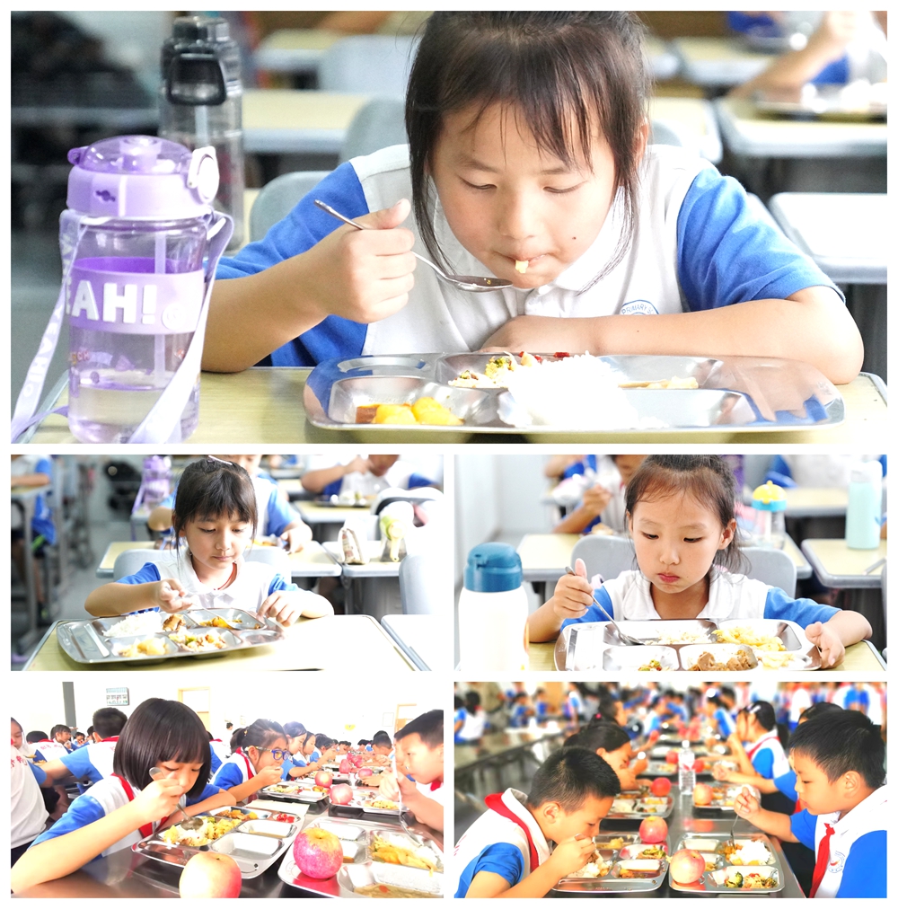 “锄禾日当午,汗滴禾下土。谁知盘中餐,粒粒皆辛苦……”中午12:10,就餐学生进入食堂后,有序排着小队到取餐处拿着餐具打饭;在食堂餐桌边坐着等候班级的学生,则吟诵起了节约粮食、爱惜食物的相关诗词;而在班上就餐的班级,为其他学生分发水果和打饭打菜的值班学生也忙得不亦乐乎。