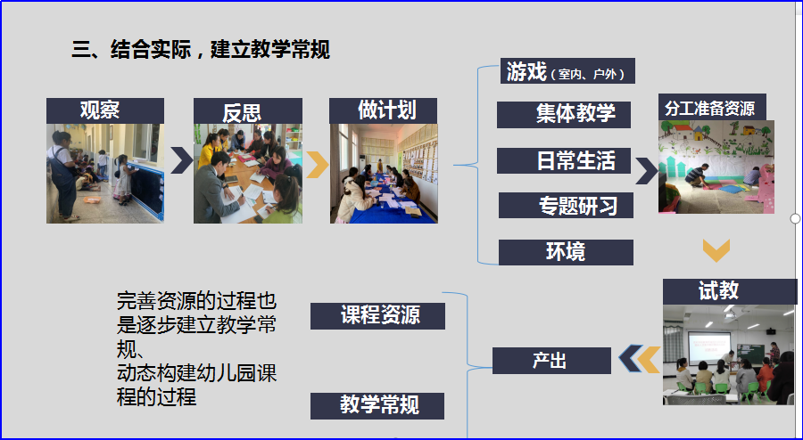 三、结合实际,建立教学常规。通过教研建立了课程构建和教学模式,改变以往“唯教材”的课程构建与实施模式,转变为通过“观察-反思-做计划,实施-观察-反思-做计划”逐步优化和构建幼儿园课程。
