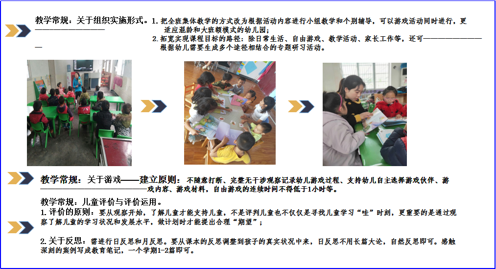 在此过程中形成了一些达成共识的教学常规,如关于一日活动安排,大版块的一日活动时间能保证幼儿每天两小时的户外活动时间和一小时的游戏时间,且更具弹性;关于游戏,给予孩子足够的游戏时间、游戏空间、丰富的材料、真正的自主,当你不知道怎么指导时,宁愿做一个静静的观察者;关于评价,不仅仅是寻找“哇时刻”,而是更加全面客观地评价孩子的现有水平,以便提出下一步合理期待;关于课程内容的选择,不知道教什么的时候可以照着教材上,当我们养成观察-反思的习惯后,发现不照着教材也能上;关于混龄班活动组织,其实集体教学也能在区域活动中完成……等等。